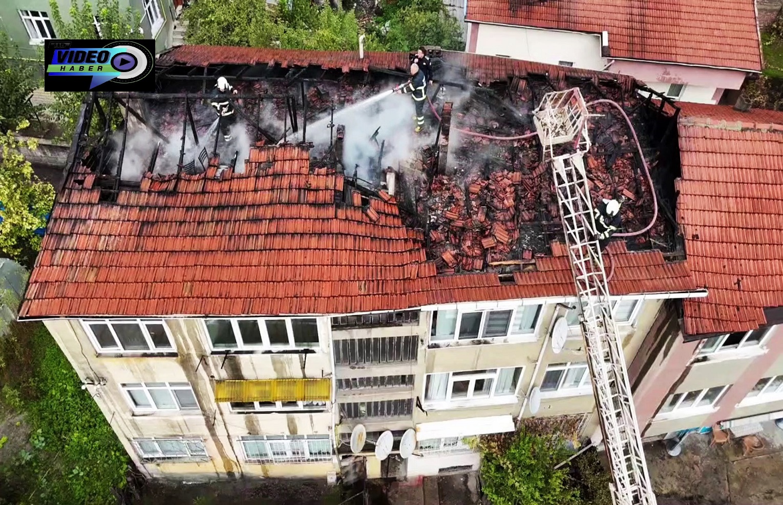 Ekiplerin kısa sürede müdahalesiyle yangın kontrol altına alınarak söndürülürken, çatıda meydana gelen hasar dron ile görüntülendi.