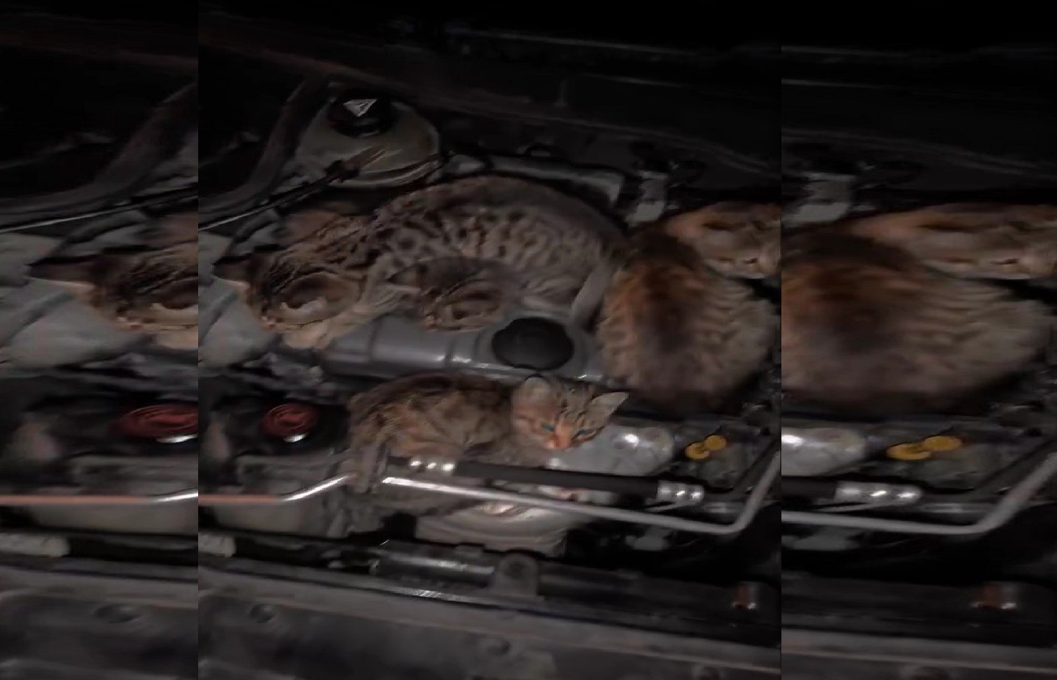 Karabük’ün Safranbolu ilçesinde soğuk havadan korunmak isteyen kedilerin sığındığı yer sürücüyü şaşırttı.