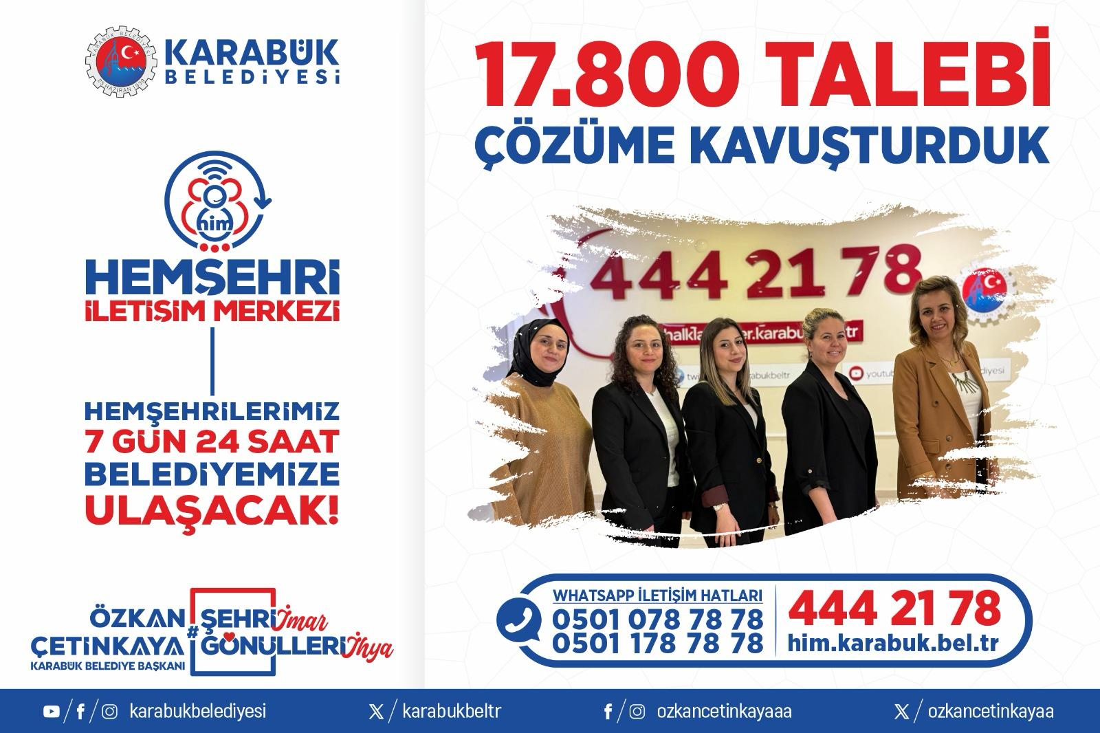 Karabük Belediyesi tarafından vatandaşların talep ve şikâyetlerini hızlı bir şekilde iletebilmesi amacıyla kurulan Hemşehri İletişim Merkezi, faaliyete geçtiği günden bu yana 17.800 başvuruyu çözüme ulaştırdı.
