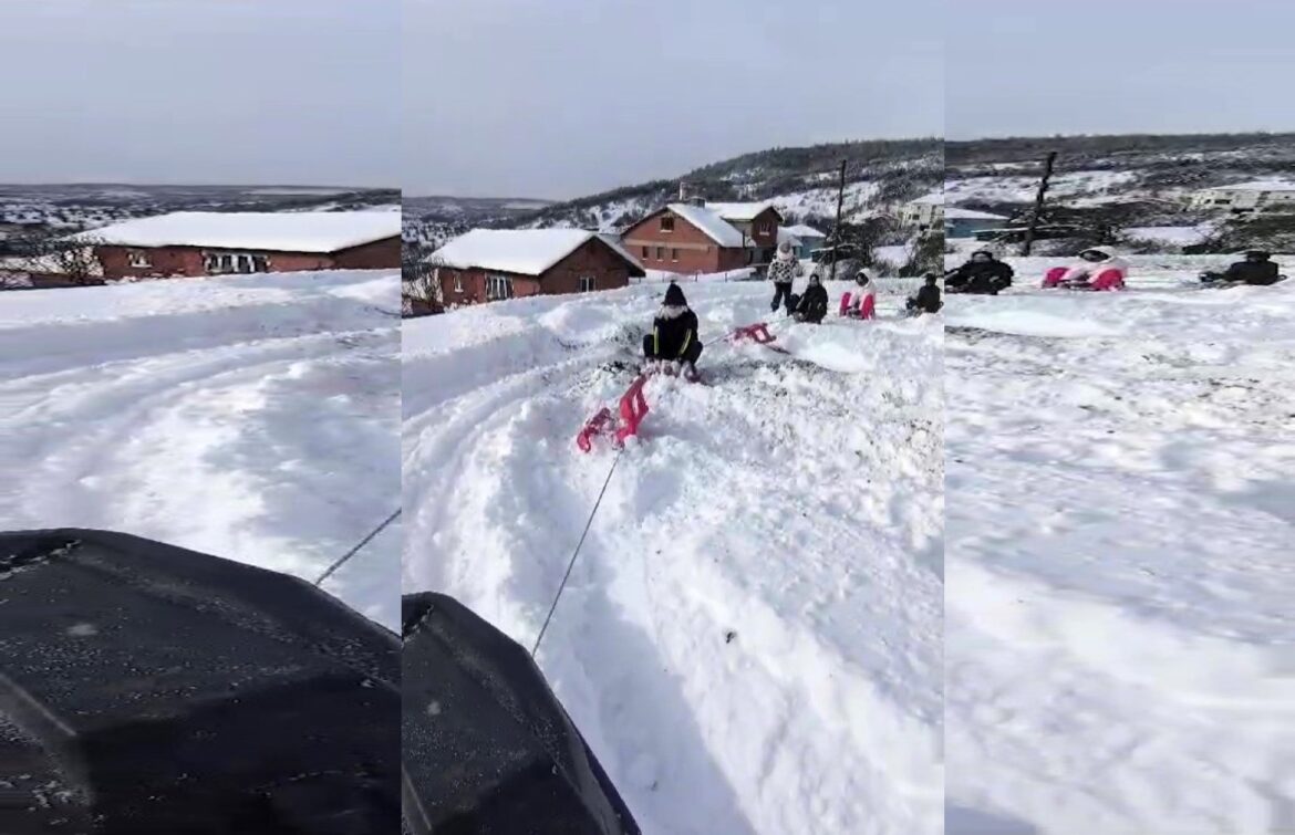 Karabük’ün Eflani ilçesinde etkili olan kar yağışı sonrası kar kalınlığı yer yer 1 metreye ulaştı. İlçeye bağlı Karlı köyünde Abdullah Kamçıcı isimli şahıs ATV’nin arkasına bağladığı kızaklarla gençlere kayak keyfi yaşattı.