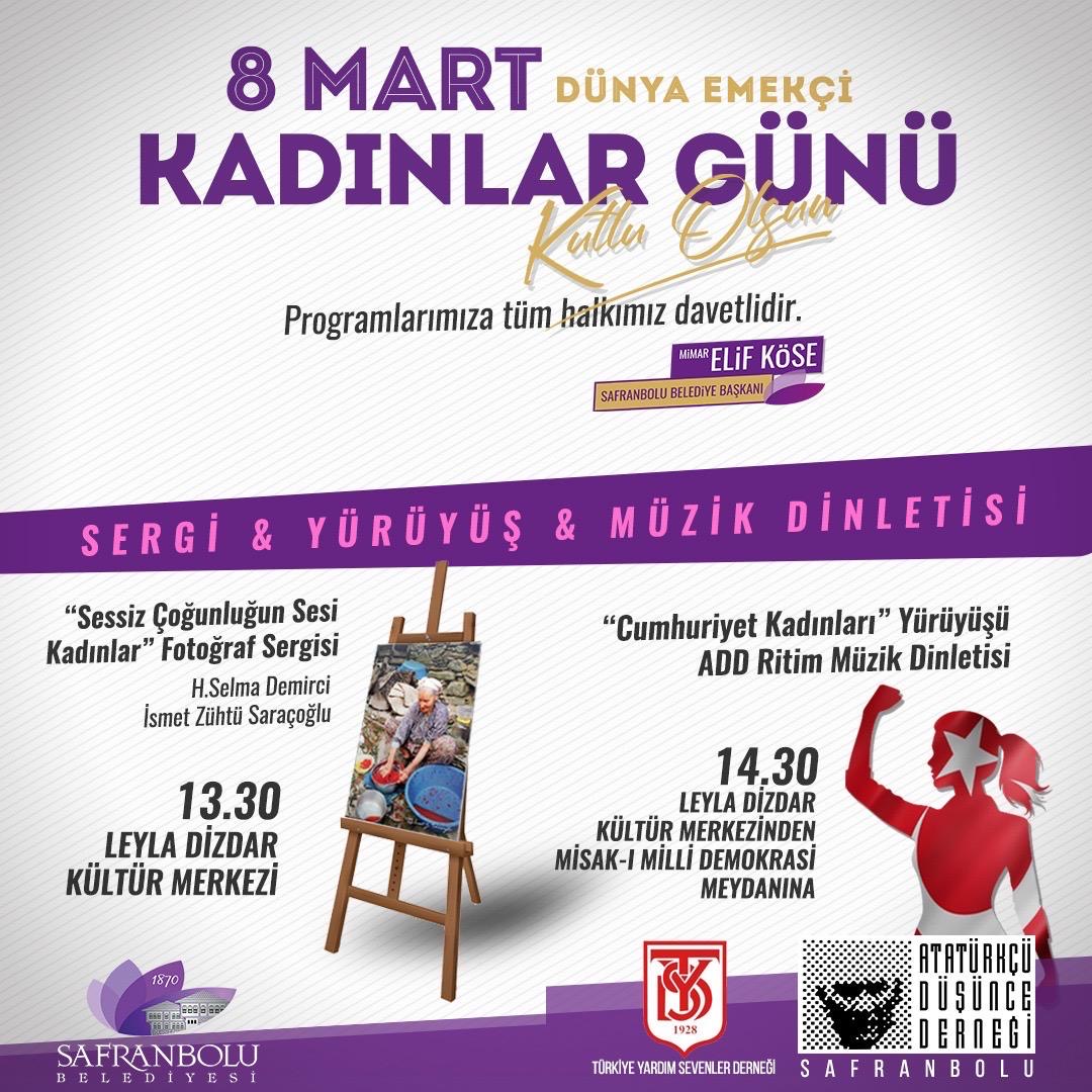 Safranbolu Belediyesi öncülüğünde, 8 Mart Dünya Emekçi Kadınlar Günü’ne özel dolu dolu bir program hazırlandı. Safranbolu Belediyesi ve Safranbolu Atatürkçü Düşünce Derneği (ADD) paydaşlığında düzenlenen etkinlikler kapsamında sergi, yürüyüş ve müzik dinletisi gerçekleştirilecek. Türkiye Yardım Sevenler Derneği Safranbolu Şubesi de programlara destek verecek.