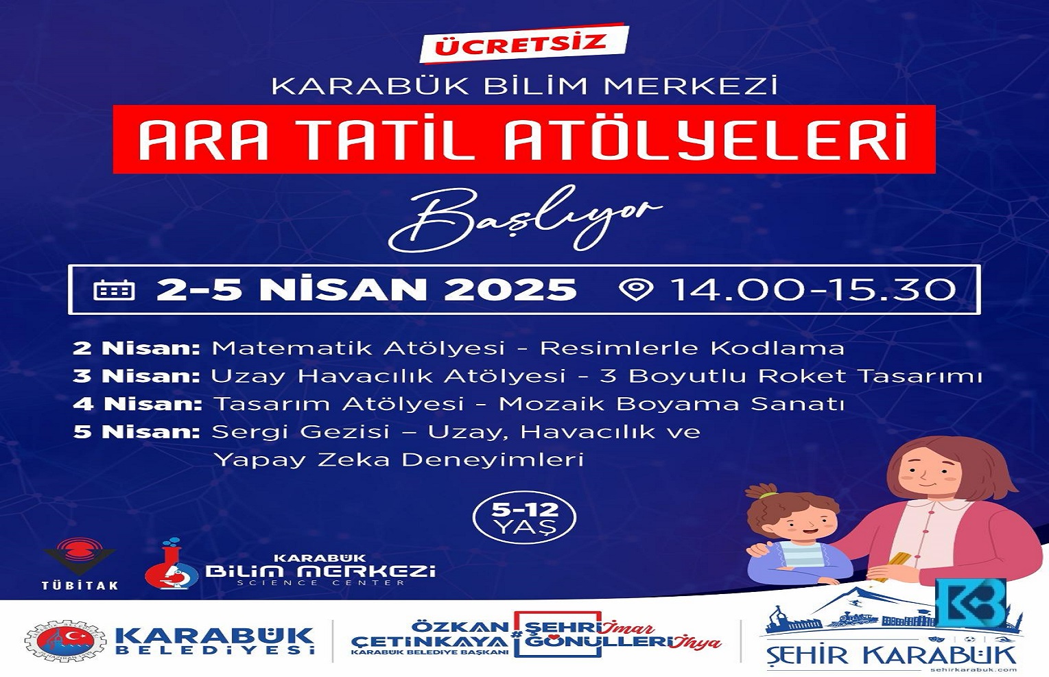 Karabük Belediyesi ile TÜBİTAK iş birliğinde faaliyet gösteren Karabük Belediyesi Bilim Merkezi, ara tatilde çocuklara bilim ve eğlence dolu bir program sunuyor. 2-5 Nisan 2025 tarihleri arasında gerçekleşecek “Ara Tatil Atölyeleri” ile 5-12 yaş aralığındaki çocuklar, hem eğlenecek hem de yeni şeyler öğrenme fırsatı bulacak.