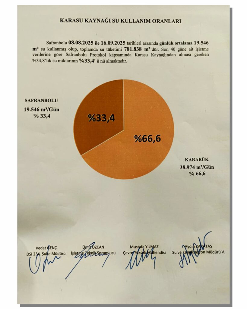 Safranbolu 08.08.2025 ile 16.09.2025 tarihleri arasında günlük ortalama 19.546 m³ su kullanmış olup, toplamda su tüketimi 781.838 m³’dür. Son 40 güne ait işletme verilerine göre Safranbolu Protokol kapsamında Karasu Kaynağından alması gereken %34,8’lik su miktarının %33,4’ü nü almaktadır.