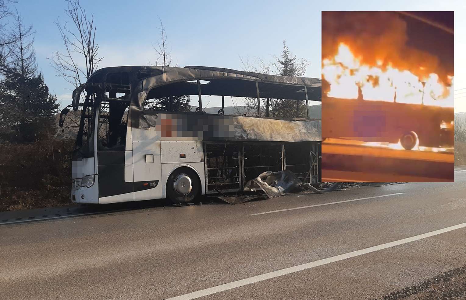 Karabük’ün Eskipazar ilçesinde seyir halindeyken motor kısmından alev alan yolcu otobüsü tamamen yanarak kullanılamaz hale geldi.