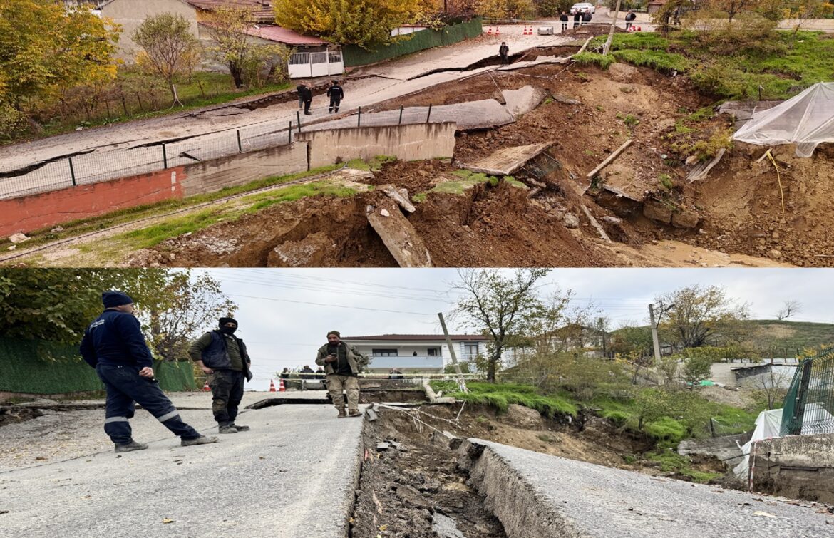 Çökmenin çevredeki yapılar ve okul inşaatı açısından risk oluşturup oluşturmadığına yönelik çalışmalar sürüyor. Çöken yol dron ile görüntülendi.